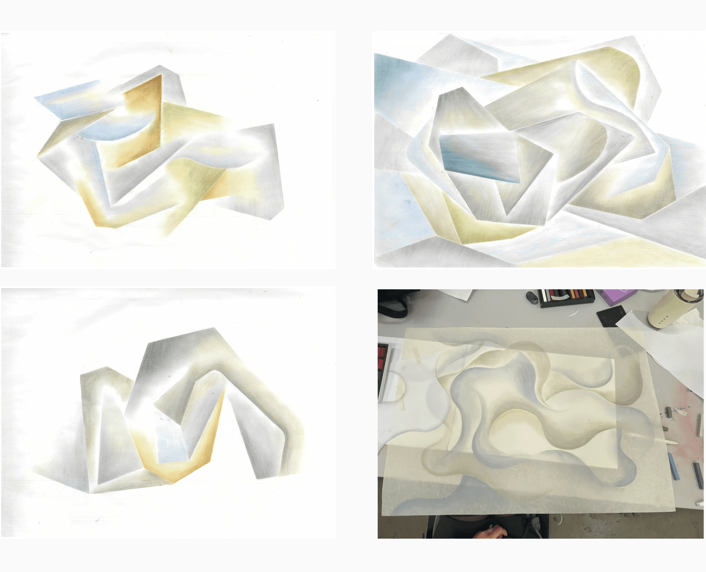 The pattern translates this feeling into a visual language. Folded fabrics and stacked forms were simplified into geometric compositions, creating an ordered surface that retains the sense of enclosure and comfort. The wallpaper turns the room into a quiet shelter, where visual repetition produces calm rather than decoration.