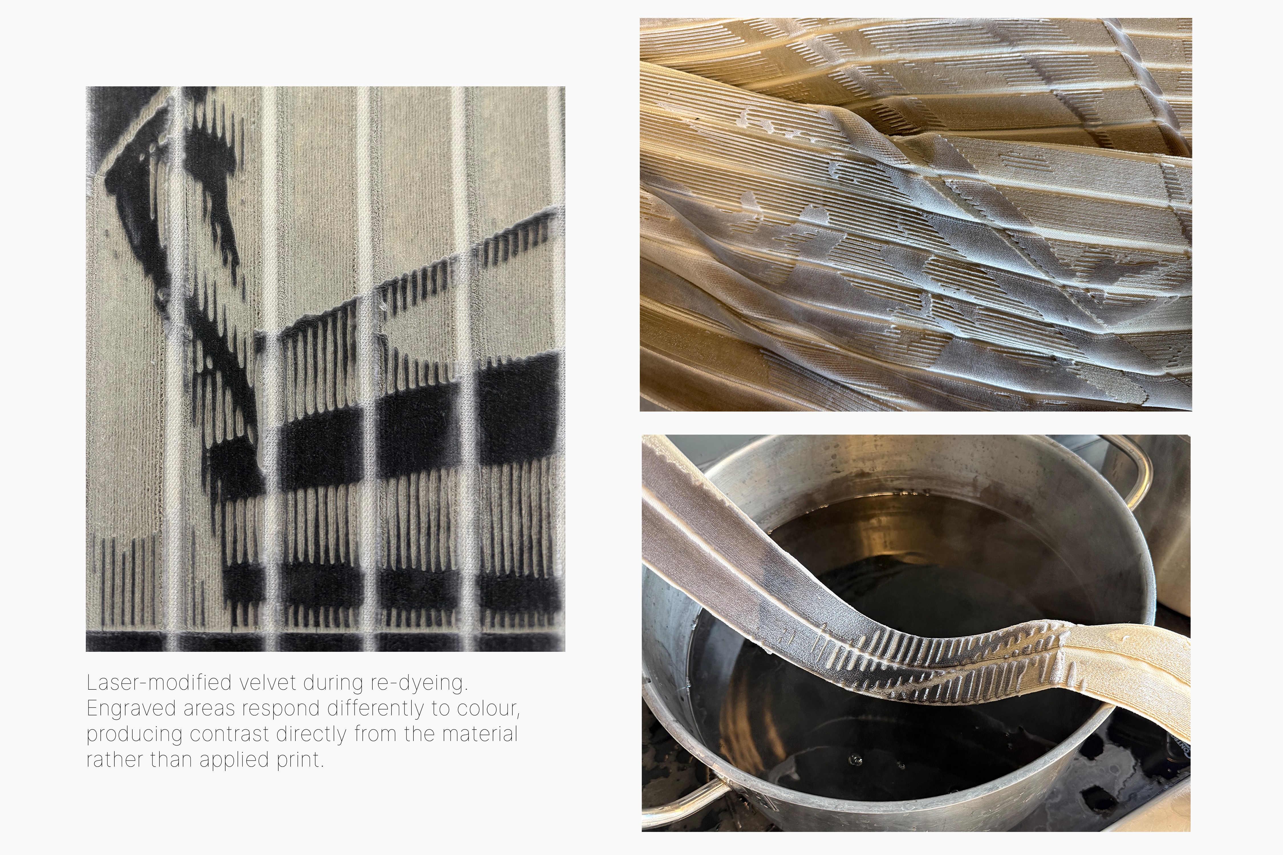 The project works with reclaimed velvet offcuts from the upholstery industry, treating discarded furnishing textiles as a starting material rather than waste. Laser engraving was used to study how different fibres react to heat. Through repeated testing, stable contrasts could be controlled directly in the material, revealing its optical behaviour instead of applying an external image.