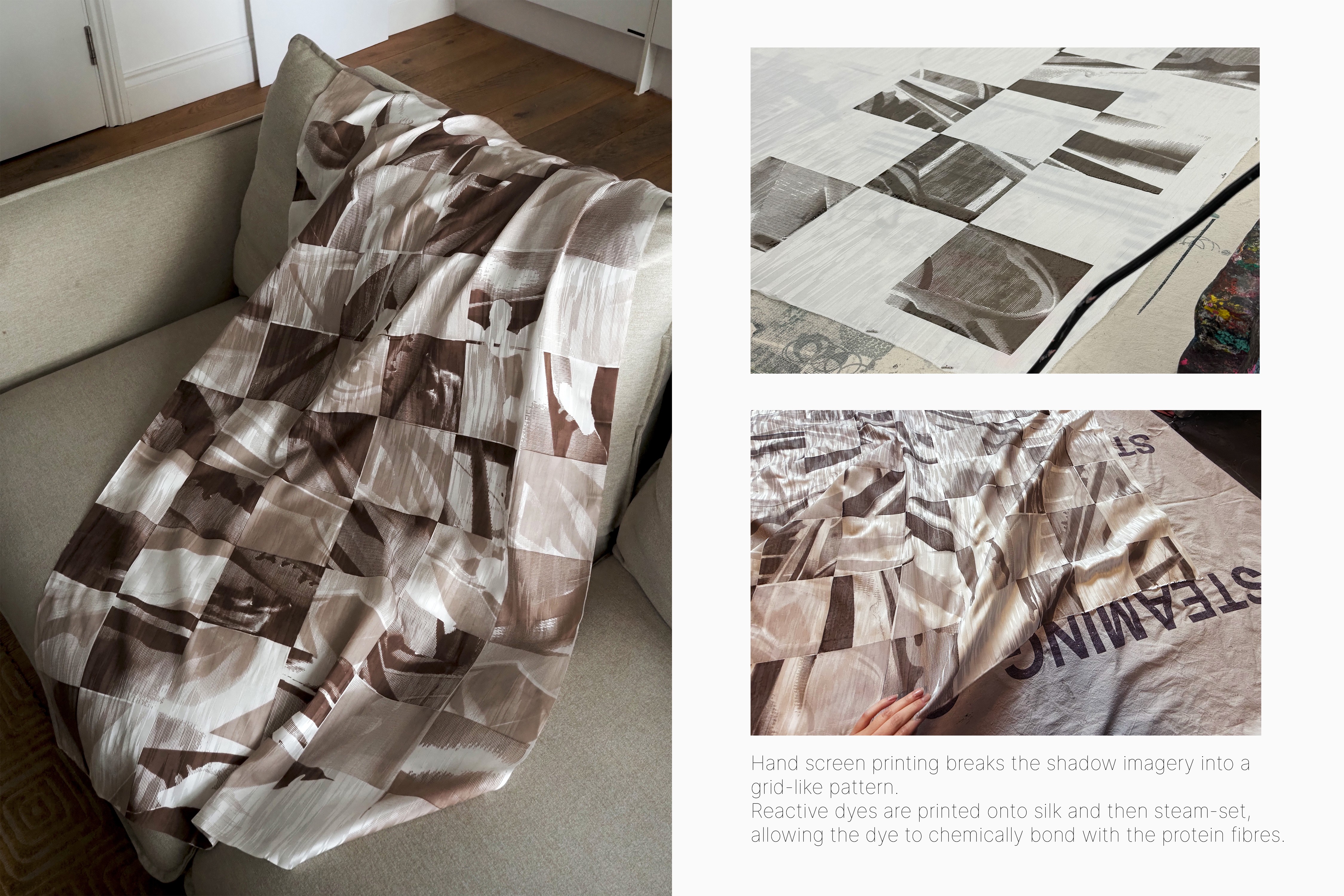 A parallel series employed traditional hand screen printing with manually prepared stencils. Using the same visual motifs as the Shadowplay pieces, the fragmented imagery extends the project’s exploration of shadow, not as ornament but as a recurring presence across the series.